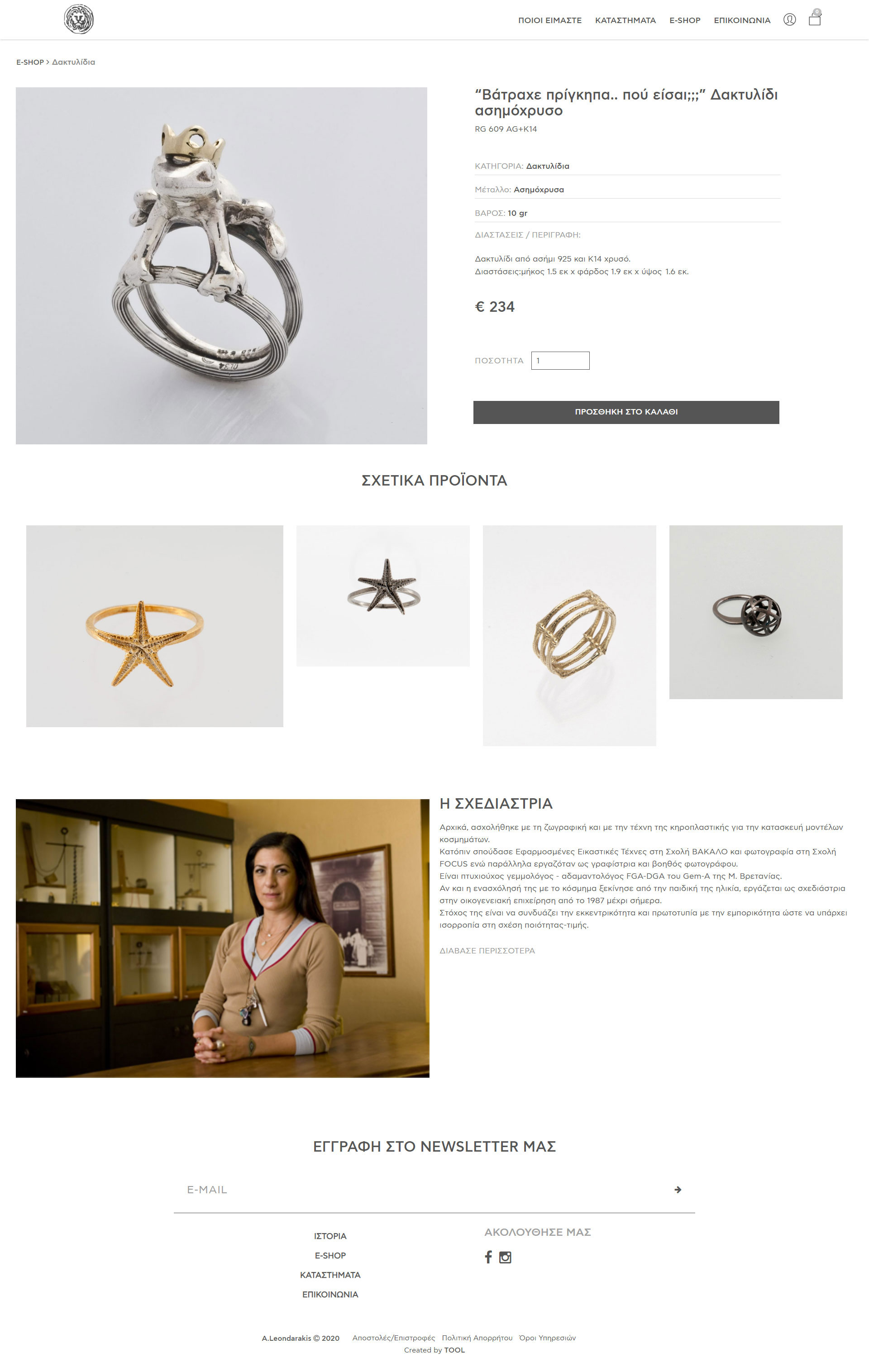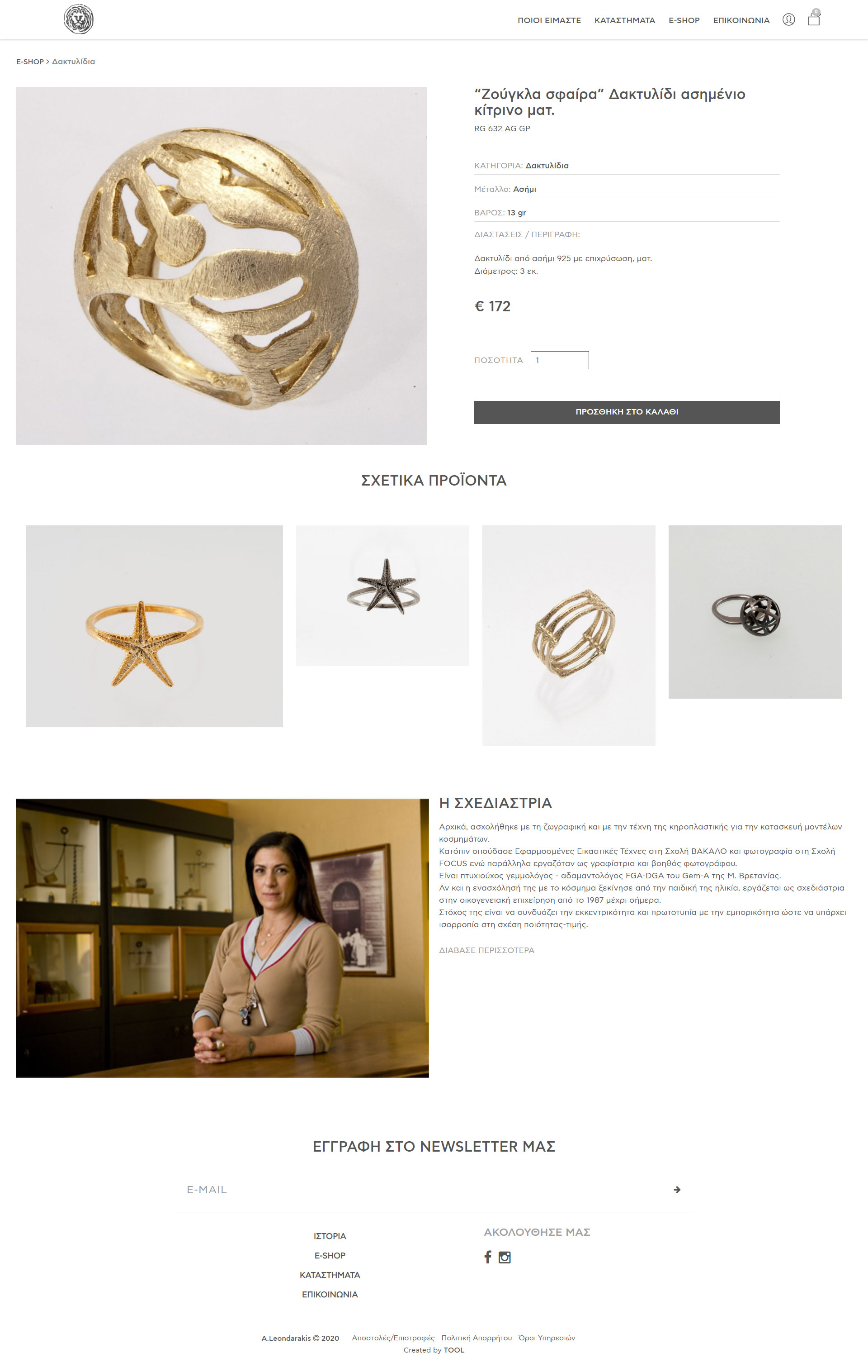 Η Tool ανέλαβε τη σχεδίαση και ανάπτυξη του ηλεκτρονικού καταστήματος, με κύριο στόχο την υλοποίηση ενός σύγχρονου eshop με minimal web design που αναδεικνύει τα κοσμήματα της εταιρείας και εξασφαλίζει τη βέλτιστη παρουσίαση σε όλες τις συσκευές. Ιδιαίτερη σημασία δόθηκε στην πλοήγηση στις κατηγορίες των προϊόντων, έτσι ώστε ο χρήστης να μπορεί να εντοπίσει εύκολα τα κοσμήματα που τον ενδιαφέρουν.