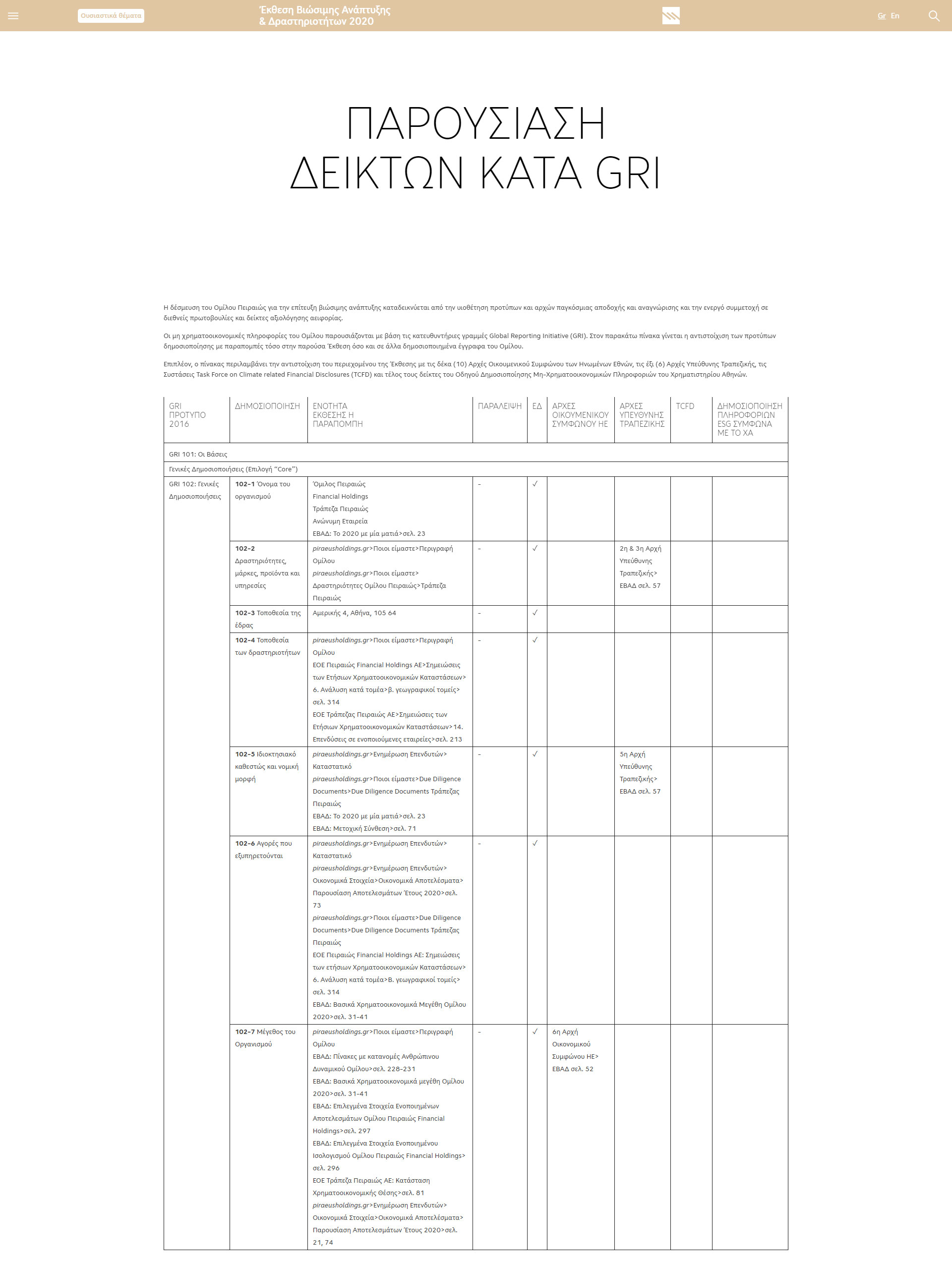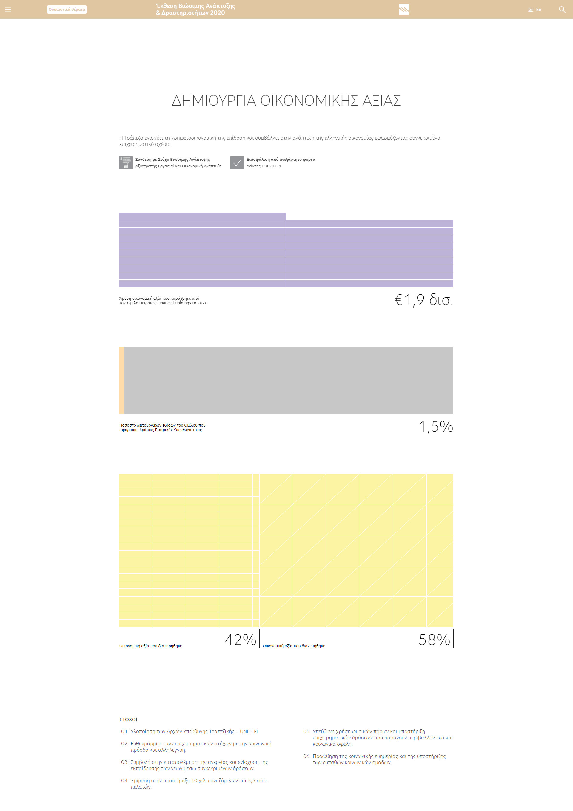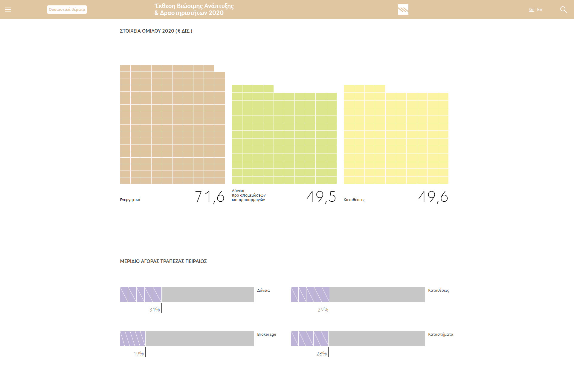 Το website για την Έκθεση Βιώσιμης Ανάπτυξης & Δραστηριοτήτων 2020 της Τράπεζας Πειραιώς αποτελεί την ηλεκτρονική έκδοση της έντυπης έκδοσης της Έκθεσης. Απευθύνεται στους επενδυτές της τράπεζας και περιλαμβάνει όλα τα οικονομικά στοιχεία αλλά και κάνει απολογισμό των δραστηριοτήτων της χρονιάς 2020.